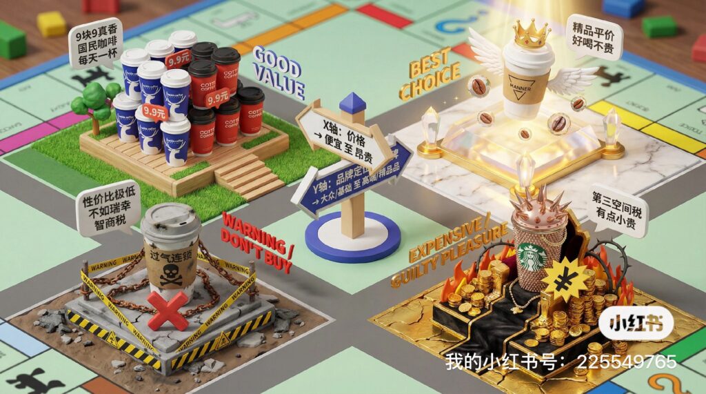 例如饮料:X轴=难喝 -> 好喝;Y轴=不健康 -> 健康。